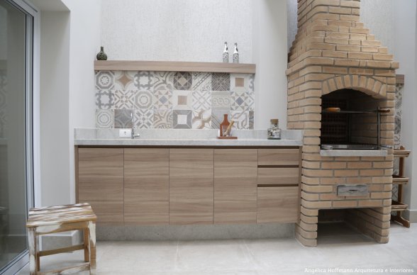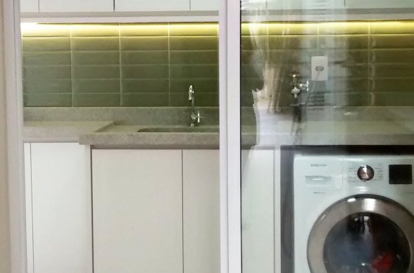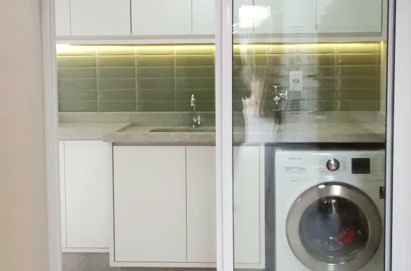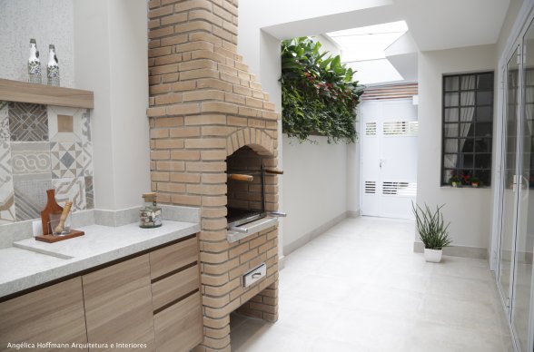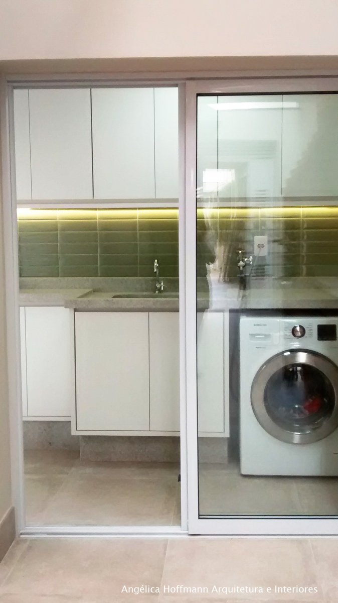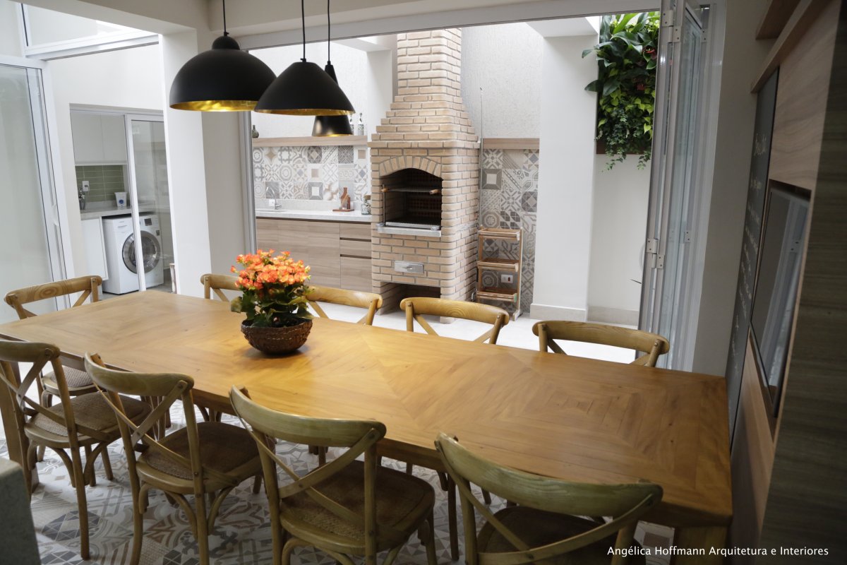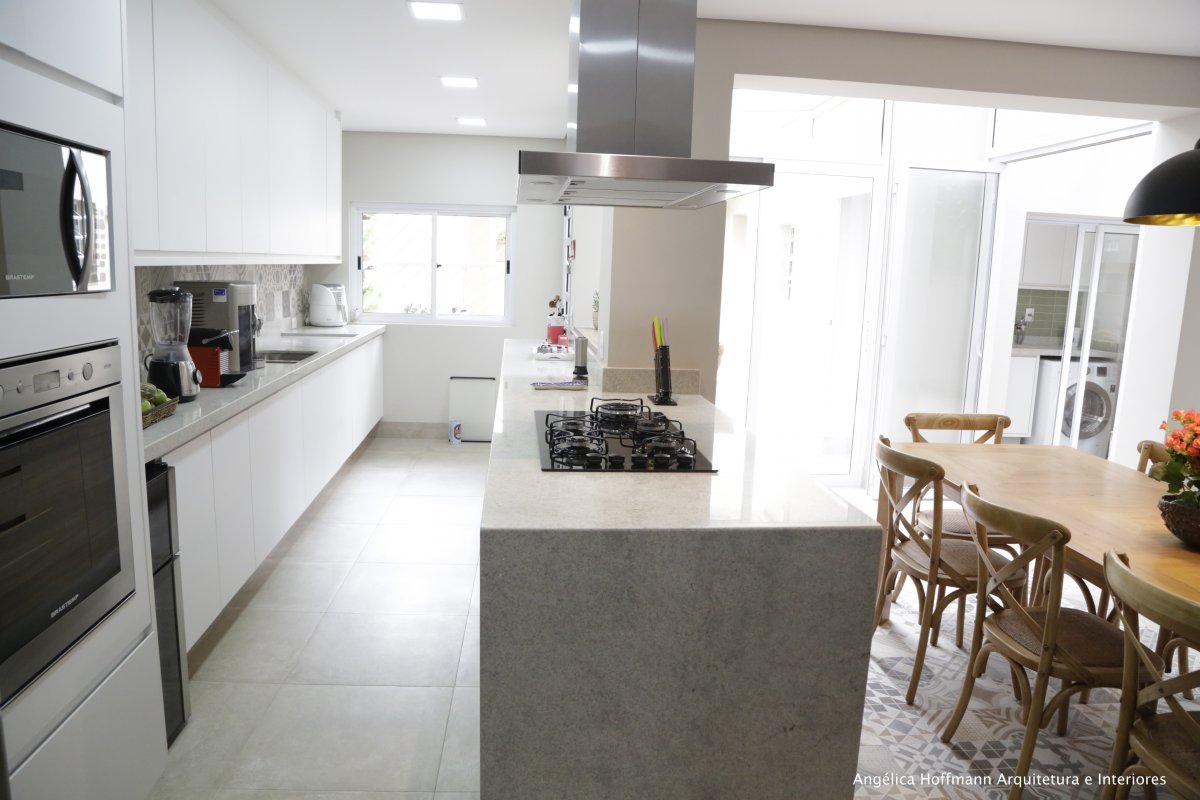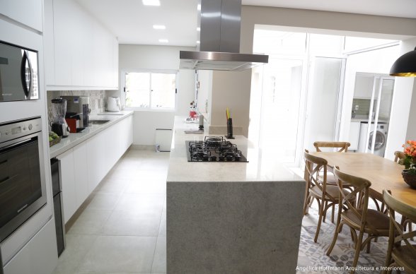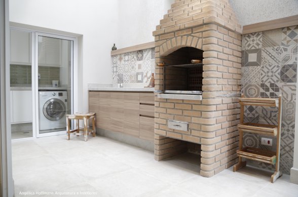 Simplesmente abrimos duas paredes da cozinha e integramos com a churrasqueira e pátio. A lavanderia existente era muito grande, e precisávamos construir um banheiro ali, então a solução foi dividir o espaço que era apenas uma lavanderia grande e desengonçada, para um espaço menor, mas muito bem planejado sobrando espaço para um super banheiro.