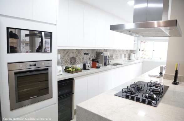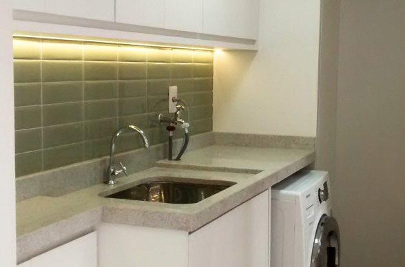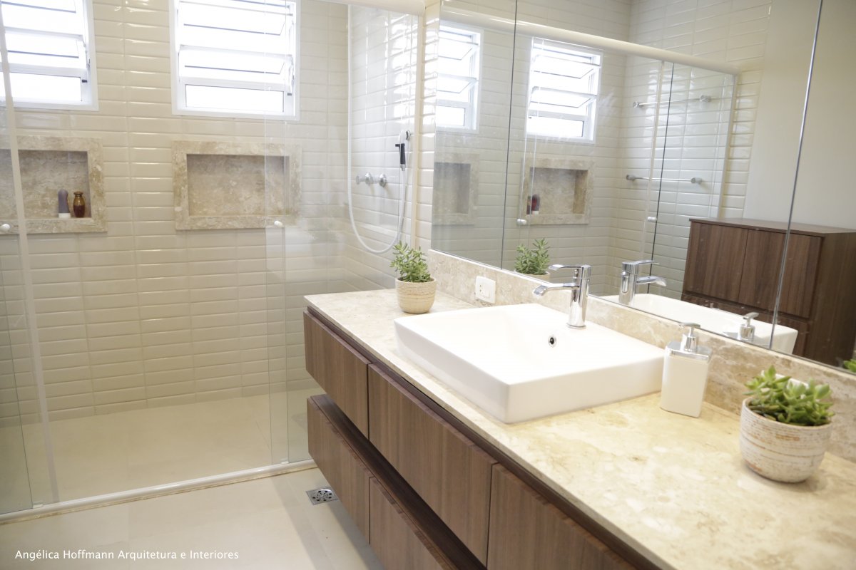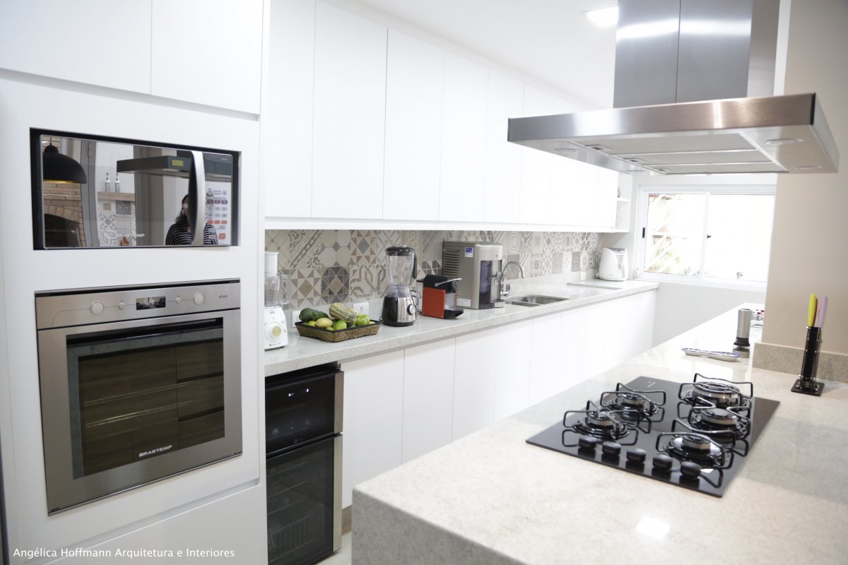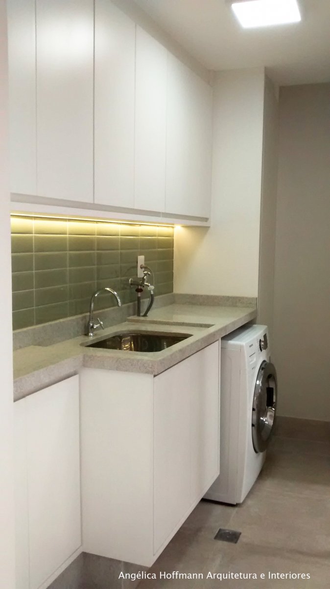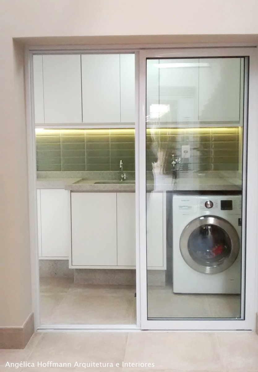 Simplesmente abrimos duas paredes da cozinha e integramos com a churrasqueira e pátio. A lavanderia existente era muito grande, e precisávamos construir um banheiro ali, então a solução foi dividir o espaço que era apenas uma lavanderia grande e desengonçada, para um espaço menor, mas muito bem planejado sobrando espaço para um super banheiro.