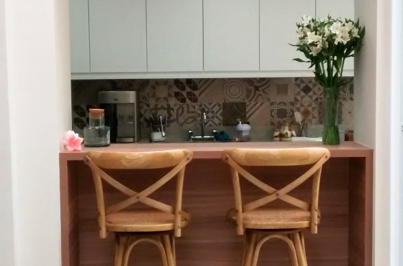 Móveis são de excelente qualidade, muito duradouros, feitos todos sob medida para o espaço. Com a luminosidade que o espaço ficou não precisar acender a luz durante o dia e para que o vidro não virasse uma estufa foram instaladas películas de proteção solar nos vidros do teto para garantir conforto térmico. As portas também de vidro foram planejadas de forma que haja uma circulação de ar e ajude a refrescar os dias mais quentes.