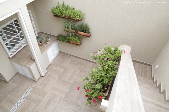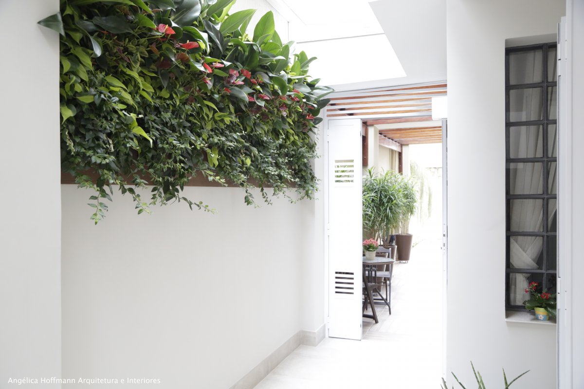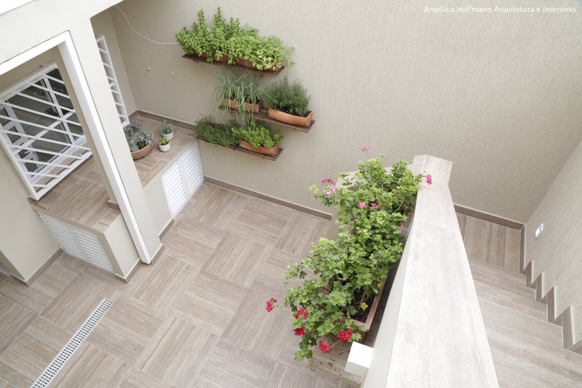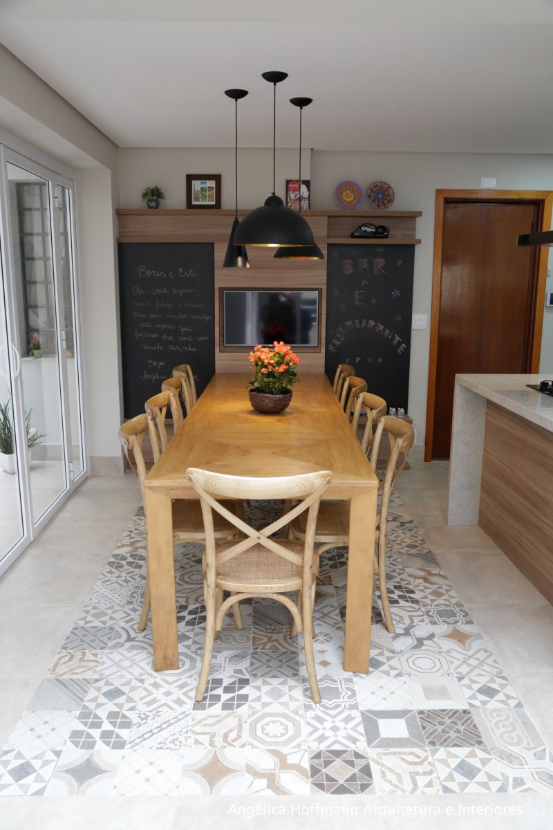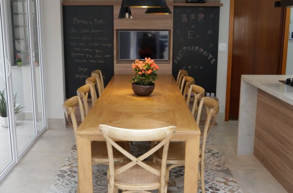 No quintal aproveitamos para fazer uma horta e na circulação lateral colocamos um painel verde que fica bem de frente para a sala de jantar. O design é muito acolhedor pelo uso da madeira e linhas retas. Bancadas incríveis de granito itaúnas, muitos armários, ilha para cozinhar e conversar e uma mesa de jantar para 11 pessoas, tudo isso integrado a churrasqueira e pátio com horta.
