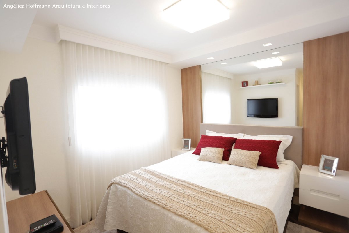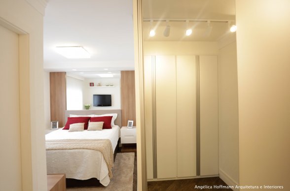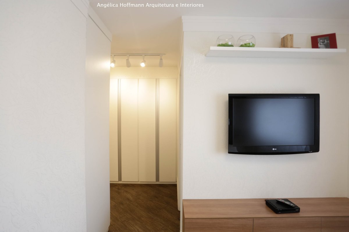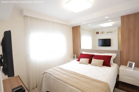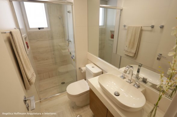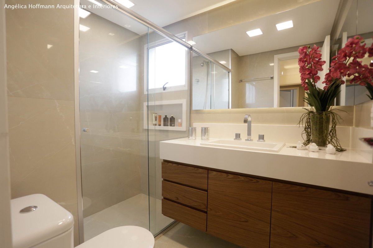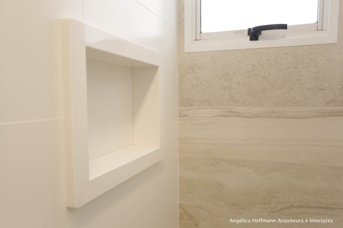 A suíte recebeu papel de parede, cabeceira, espelhos, cortina e nova iluminação. O banheiro foi todo reformado, utilizando porcelanato da Portobello tanto no piso como em todas as paredes, nicho e bancada em pedra branca, marcenaria e espelho em duas paredes.