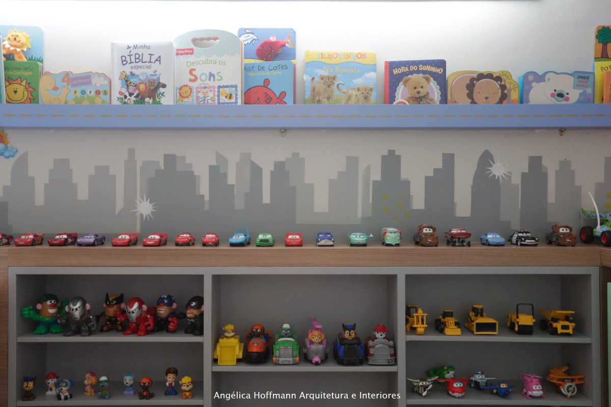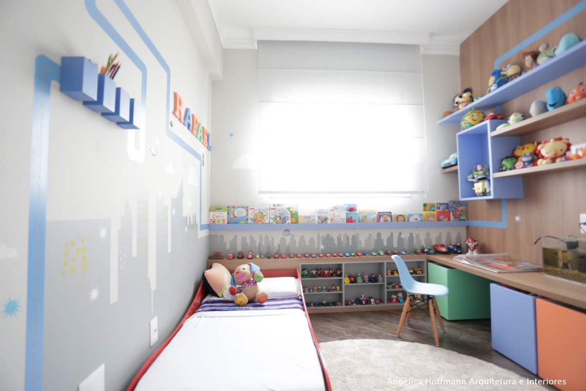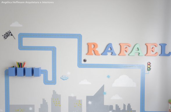 Rafa, ganhou um quartinho novo, todo planejado para seu tamanho e sua altura. E como já tinha 3 anos, não era mais tão bebê, escolheu a decoração de CARROS, desenho que ele mais gostava. Chamamos o artista Ronaldo Cazuza para desenhar a arte das paredes, toda a mão livre!