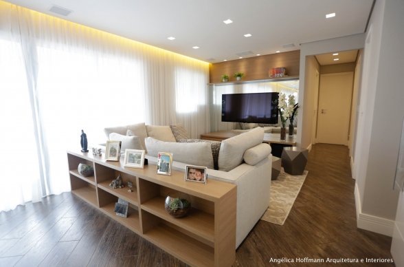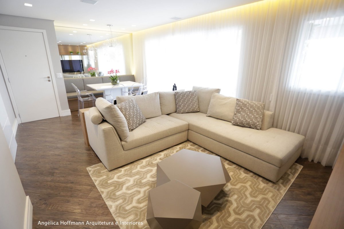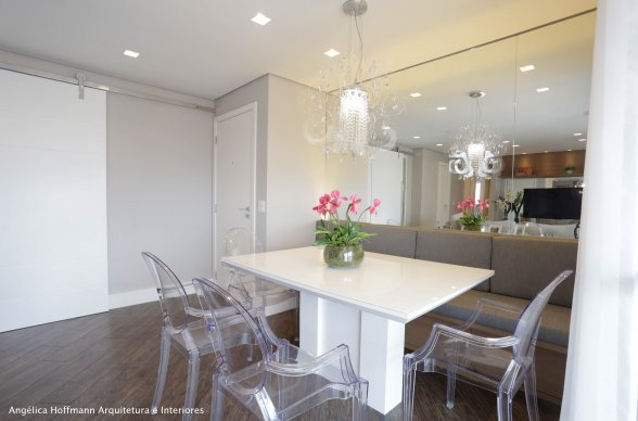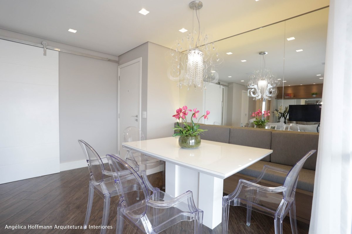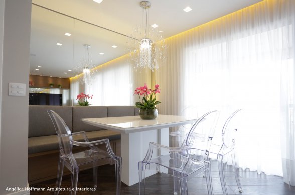 A Sala, ambiente preferido do casal, criamos dois ambientes, estar e jantar. No estar destacamos um sofá em L, tapete e pufs no centro. A sala de jantar recebeu mesa branca, banco estofado e cadeiras transparentes, junto com um lustre acrílico. As cortinas que unem os ambientes receberam destaque através da sanca iluminada.