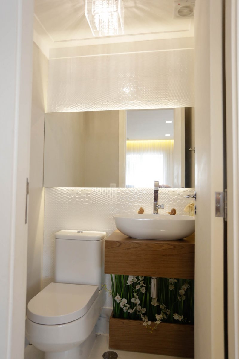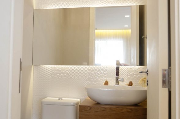 Banheiro Social foi todo reformulado, recebendo um revestimento da Portobello que traz a pedra natural para o ambiente. O lavabo, também todo reformulado, recebeu azulejo decorativo, espelho retroiluminado, bancada e cachepô em madeira.