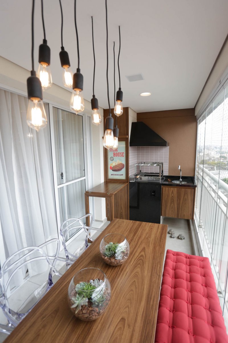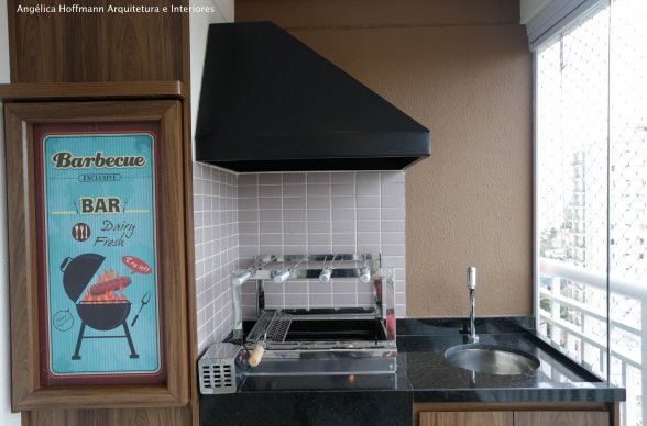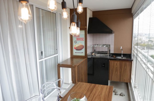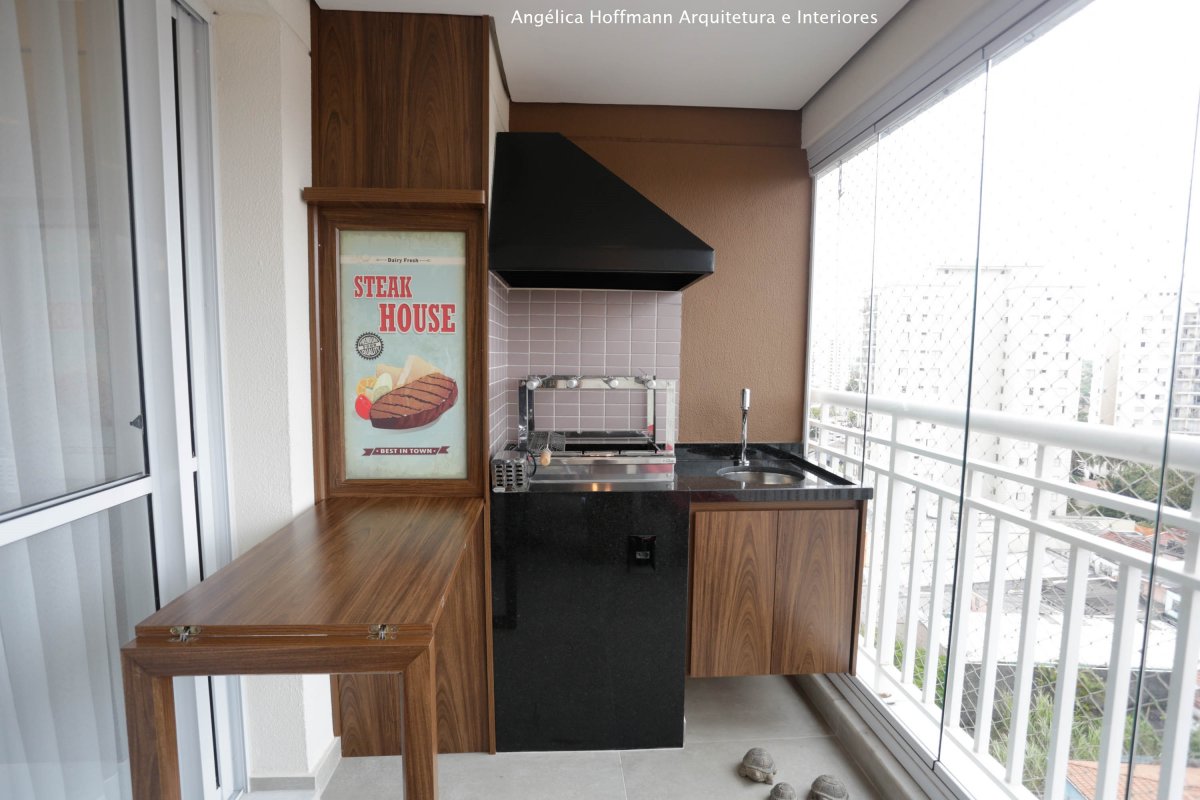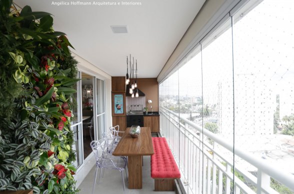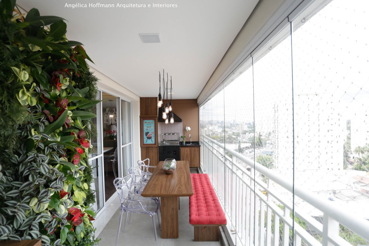 Na varanda, espaço que parecia não caber nada, conseguimos colocar uma mesa retrátil de apoio a churrasqueira, uma mesa para 6 pessoas, painel verde com rega automática e um mini-bar com adega.