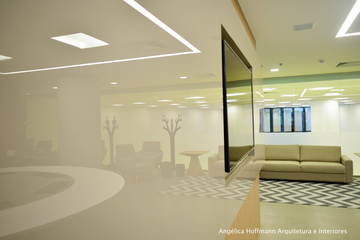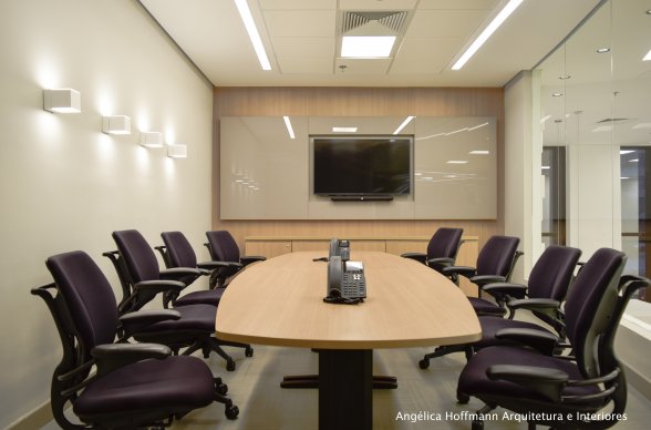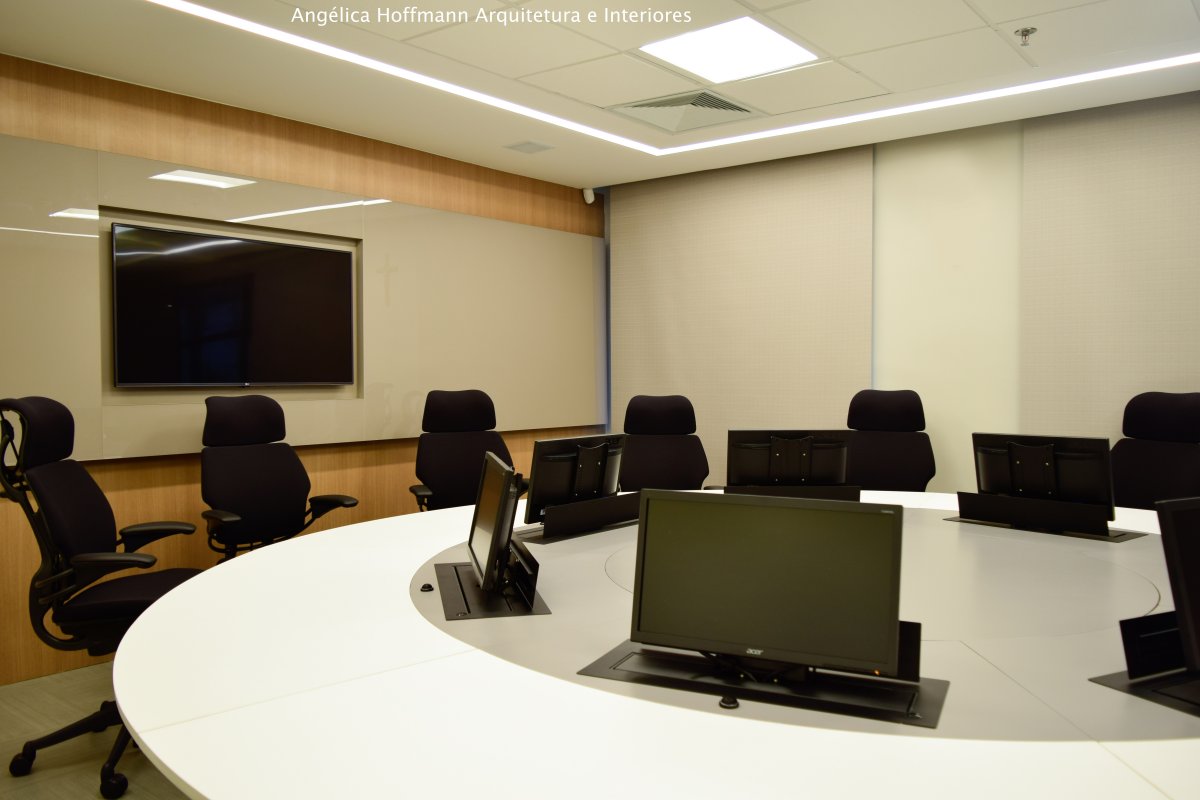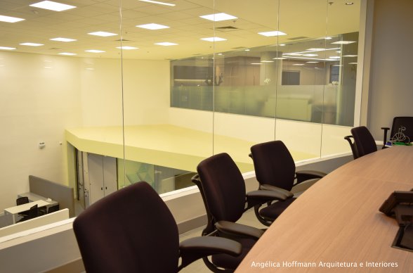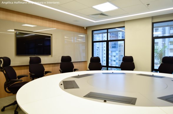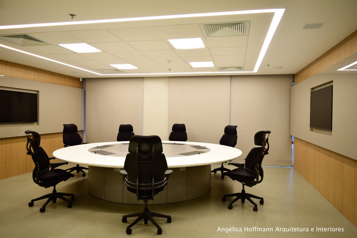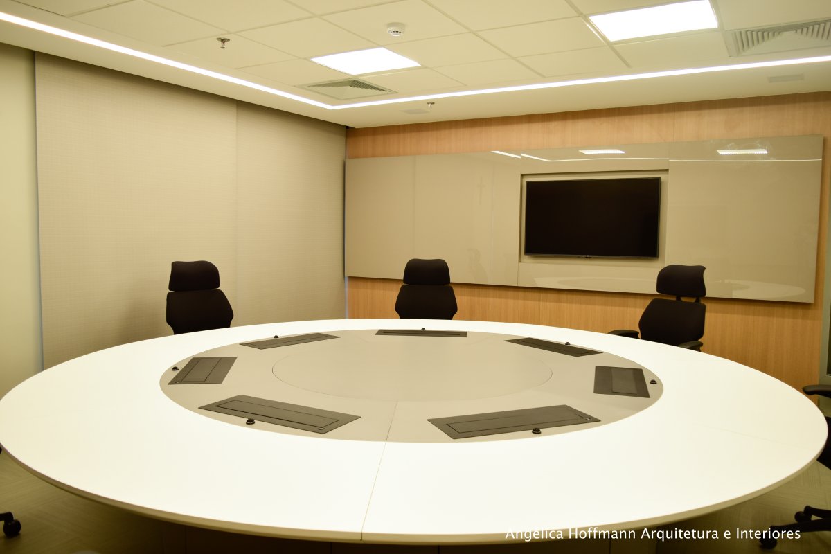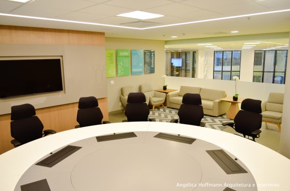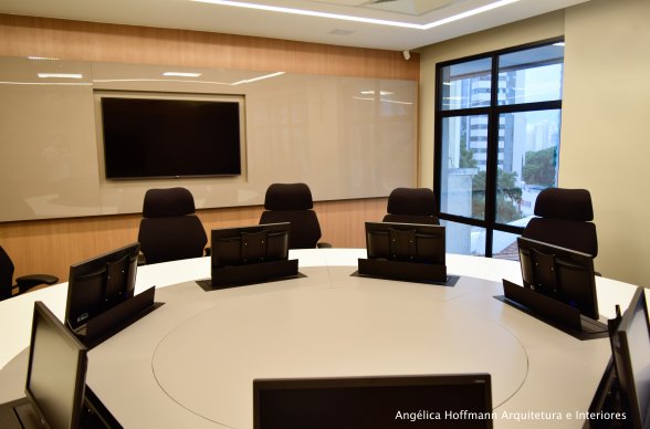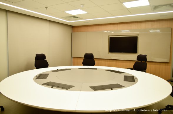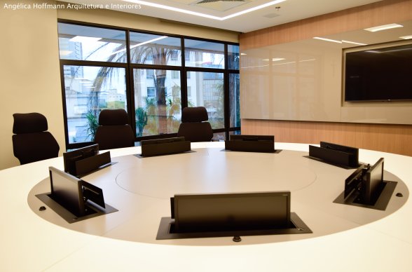 Na diretoria utilizamos madeira em tom médio e cinza criando um clima sério, mas ao mesmo tempo leve. A sala do conselho recebeu uma mesa redonda para uma conversa mais integrada com monitores tecnológicos, que por controle remoto fazem parte da reunião ou se escondem. Além das telas retráteis temos toda a iluminação e persianas controladas por controle remoto, dando flexibilidade e facilidade no momento da reunião. Junto um bar foi montado para deixar mais à vontade os participantes das longas reuniões de conselho, além de sofá e poltronas que complementam o espaço.