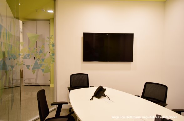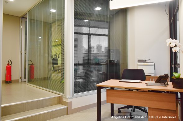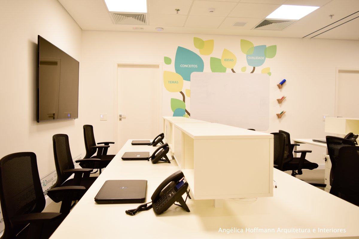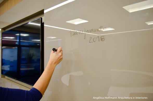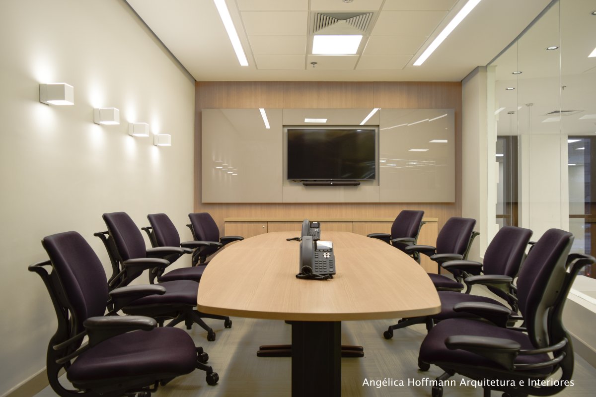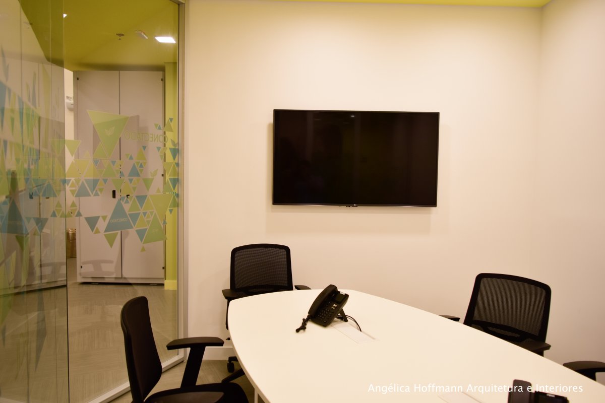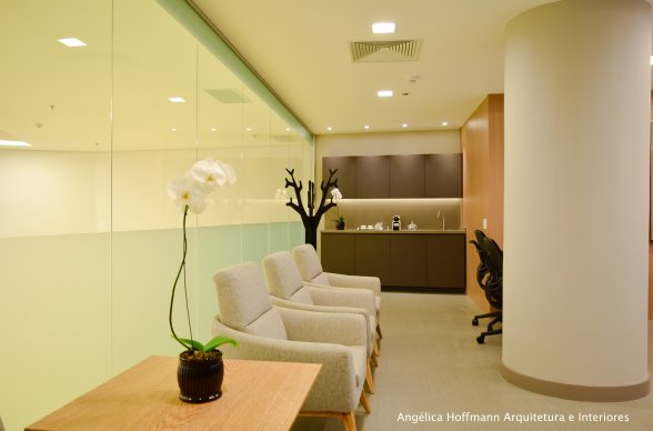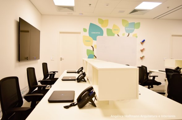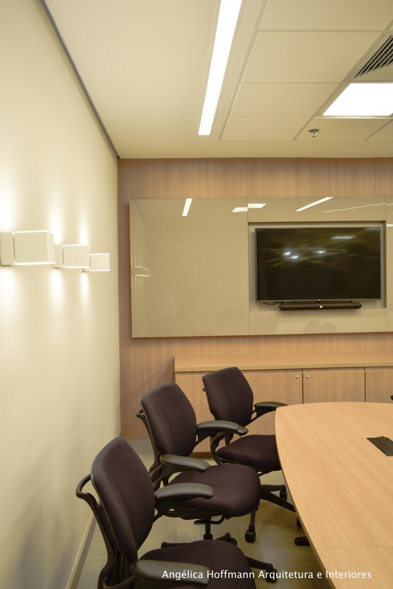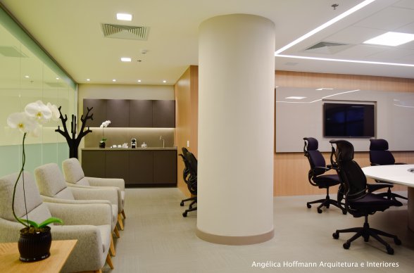 Na diretoria utilizamos madeira em tom médio e cinza criando um clima sério, mas ao mesmo tempo leve. A sala do conselho recebeu uma mesa redonda para uma conversa mais integrada com monitores tecnológicos, que por controle remoto fazem parte da reunião ou se escondem. Além das telas retráteis temos toda a iluminação e persianas controladas por controle remoto, dando flexibilidade e facilidade no momento da reunião. Junto um bar foi montado para deixar mais à vontade os participantes das longas reuniões de conselho, além de sofá e poltronas que complementam o espaço.