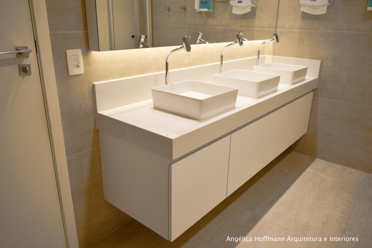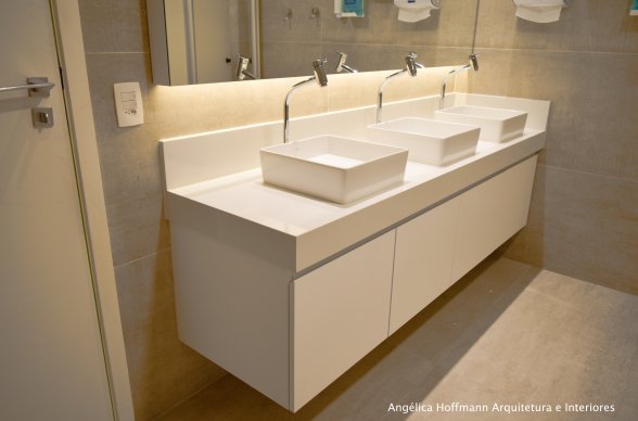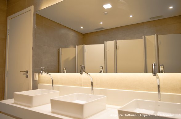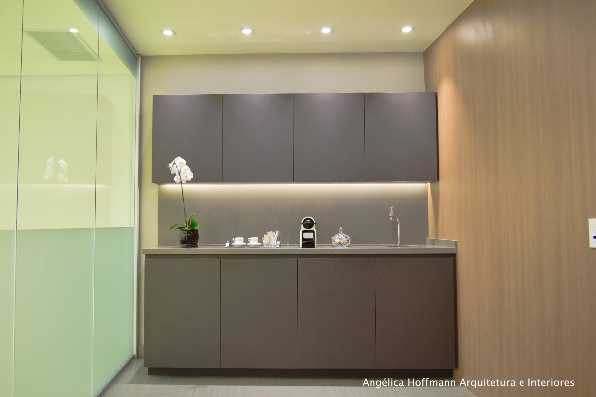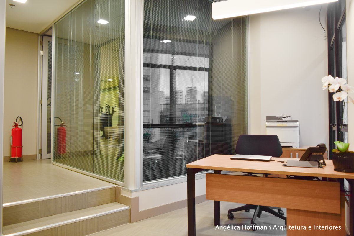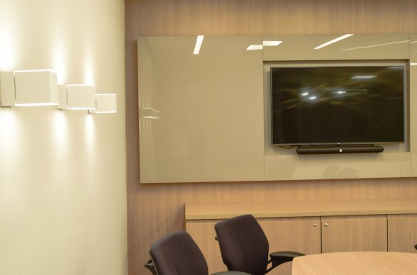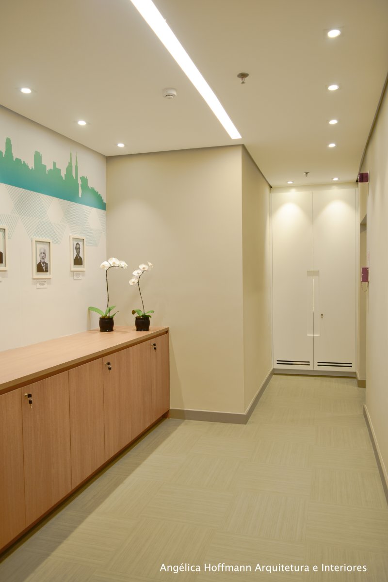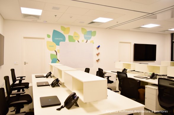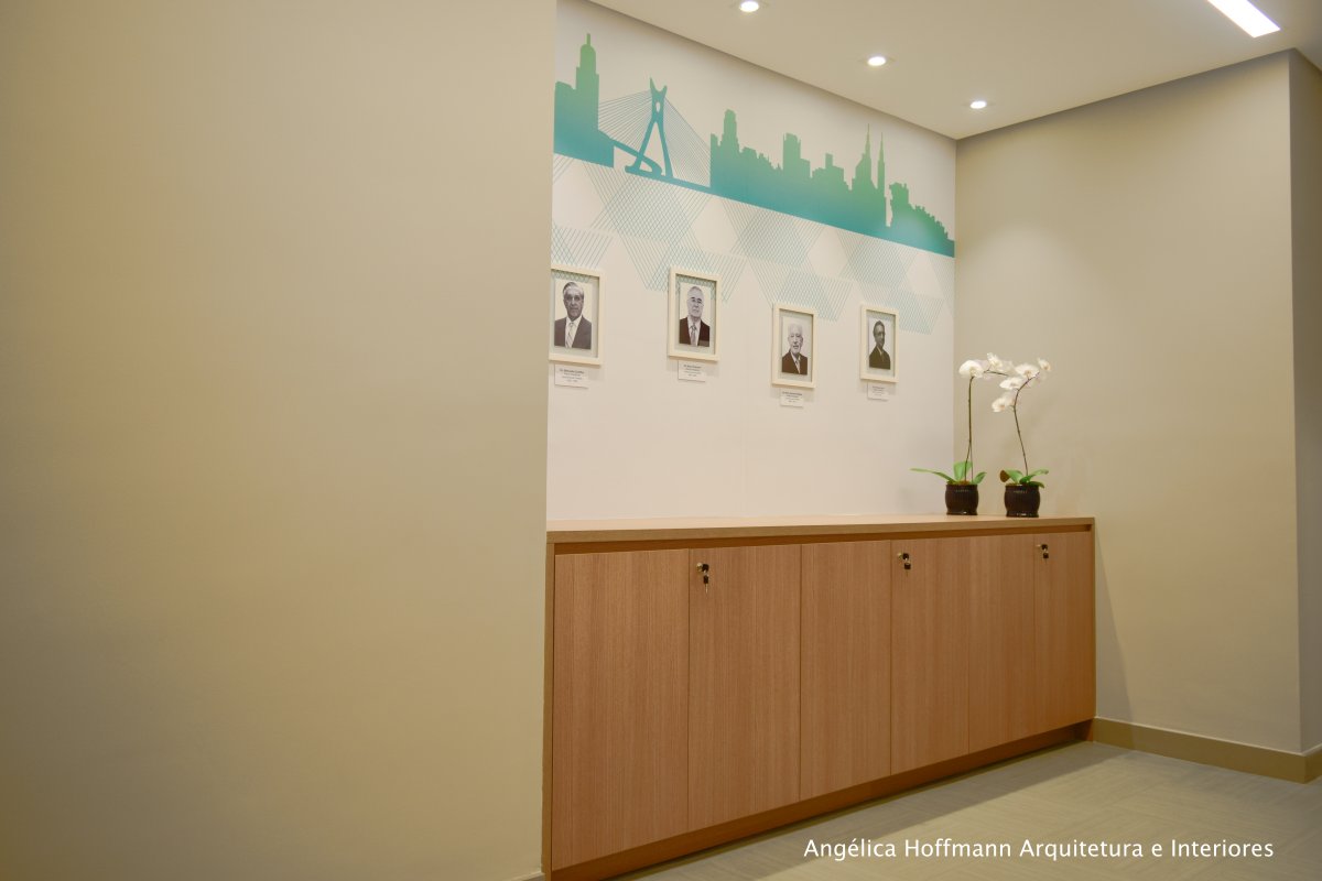 Na diretoria utilizamos madeira em tom médio e cinza criando um clima sério, mas ao mesmo tempo leve. A sala do conselho recebeu uma mesa redonda para uma conversa mais integrada com monitores tecnológicos, que por controle remoto fazem parte da reunião ou se escondem. Além das telas retráteis temos toda a iluminação e persianas controladas por controle remoto, dando flexibilidade e facilidade no momento da reunião. Junto um bar foi montado para deixar mais à vontade os participantes das longas reuniões de conselho, além de sofá e poltronas que complementam o espaço.