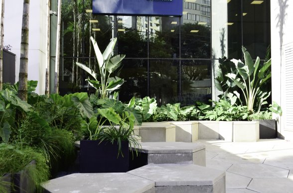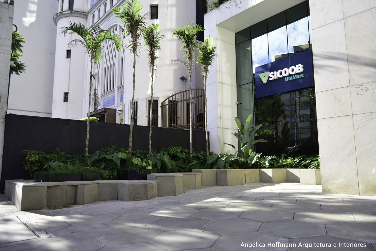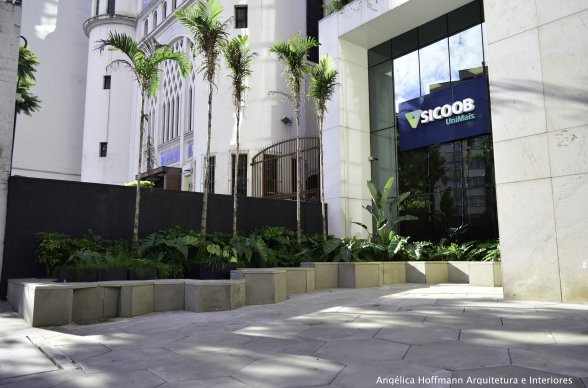No recuo frontal junto a fachada, no intuito de CONECTAR pessoas, retiramos o estacionamento existente e criamos uma praça com bancos para o uso de todos. O imóvel está localizado no térreo de um edifício comercial, aproveitando assim para criar um espaço de lazer para todas as pessoas que por ali circulam, principalmente as que trabalham no edifício.