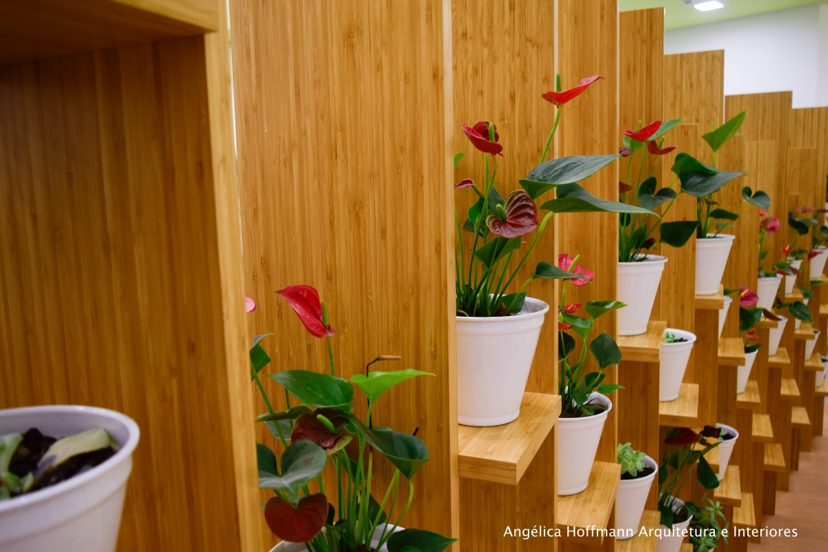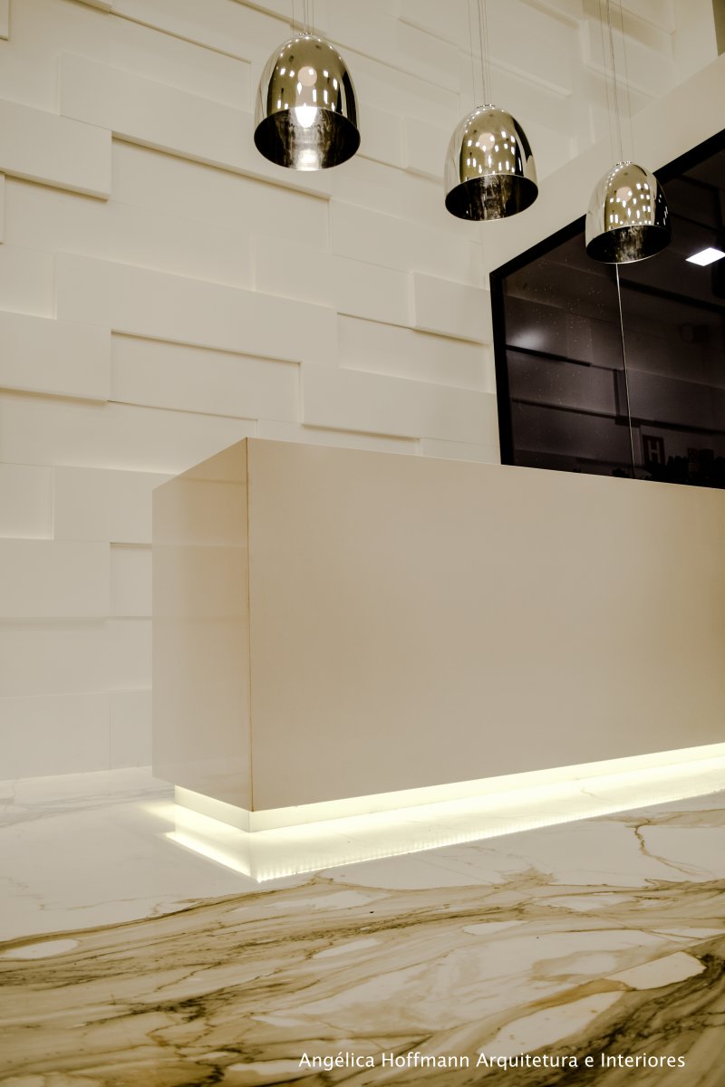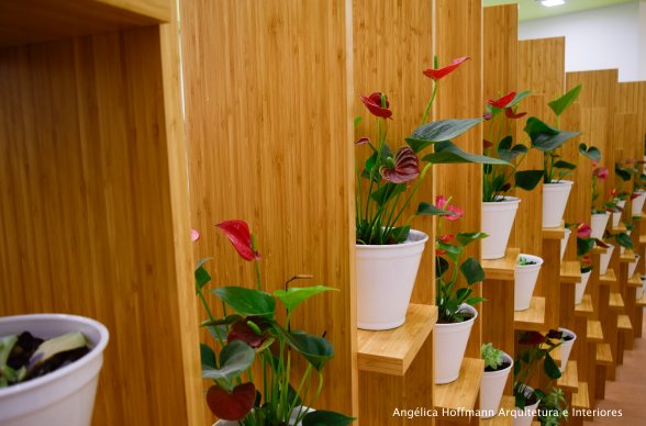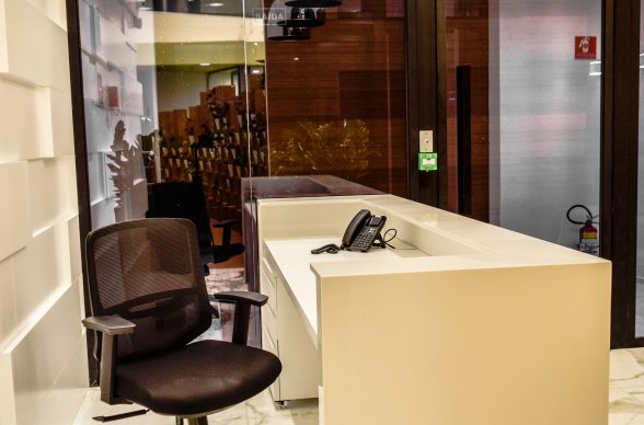 O imóvel conta com um amplo espaço térreo com pé-direito duplo, um mezanino, uma área livre nos fundos e outra frontal. No térreo, logo na entrada reaproveitamos um piso de mármore italiano existente no local e adaptamos o espaço de espera com um balcão em pedra branca e iluminação direcional. Na circulação que leva para distribuição de todo o restante do imóvel criamos uma estante divisória que delimita o espaço e ao mesmo tempo mostra a amplitude do lugar. Esta estante recebeu vasinhos com plantas, onde ao final de um evento pode se tornar brinde aos participantes, tornando assim o espaço de circulação muito mais funcional, dinâmico e agradável.