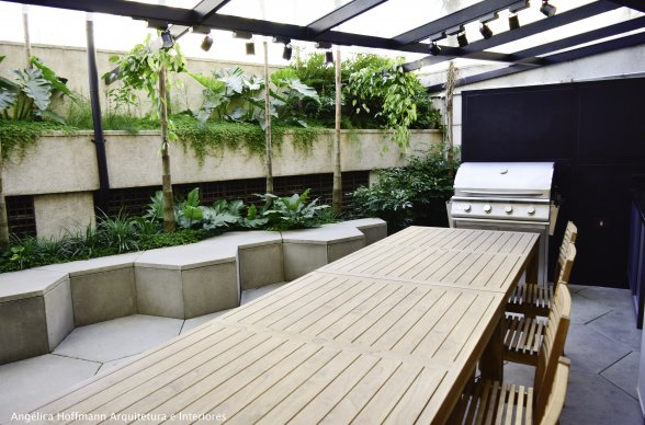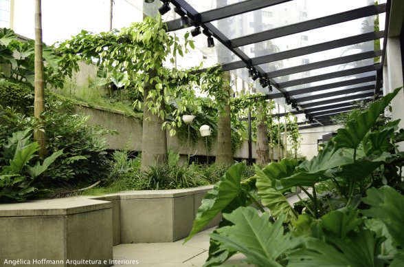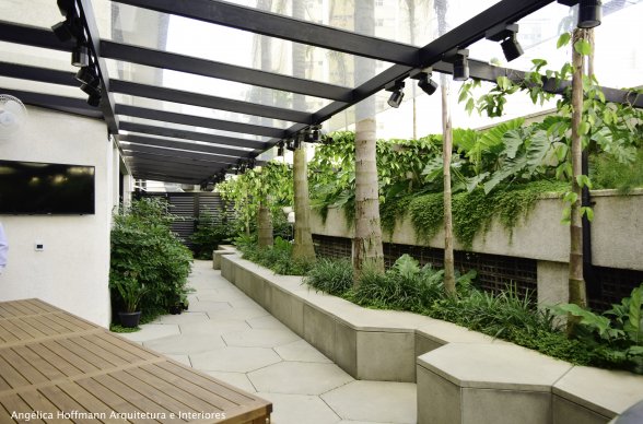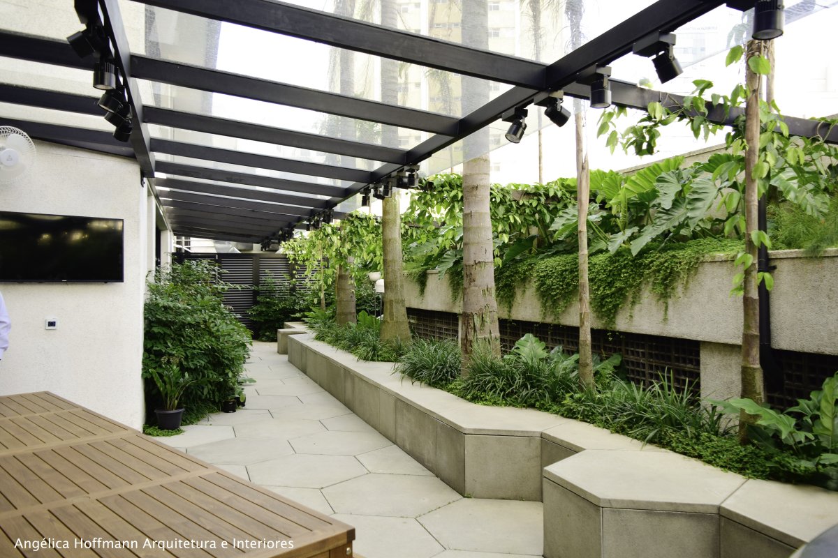 Numa área mais íntima, externa também, criamos um espaço para CONECTAR os colaboradores que ali trabalham e convivem diariamente. Este espaço é interligado à copa e possui uma área com churrasqueira, cobertura de vidro e uma área ajardinada com muitos bancos.