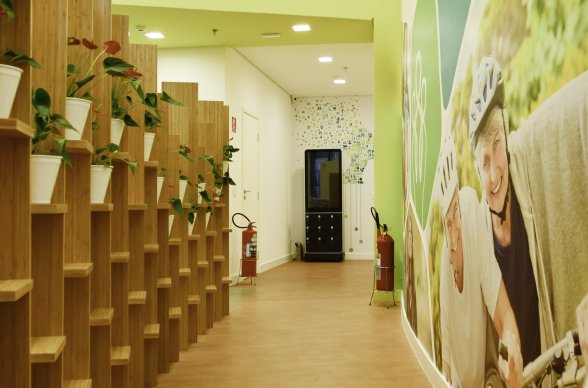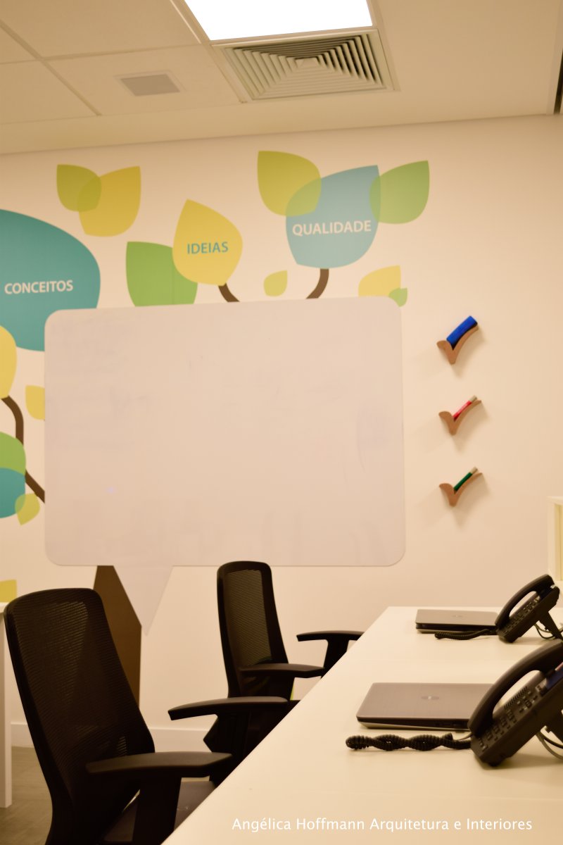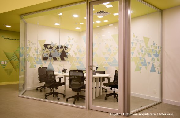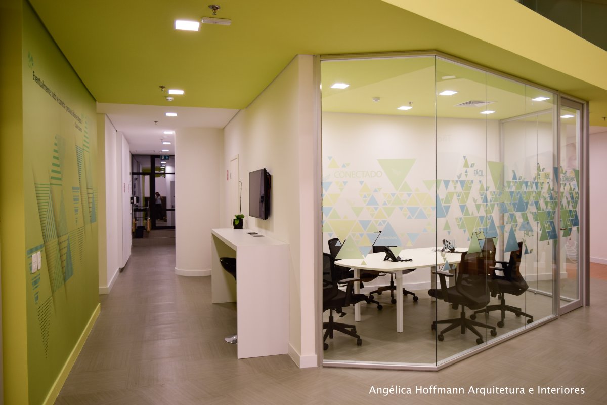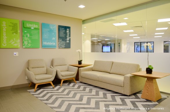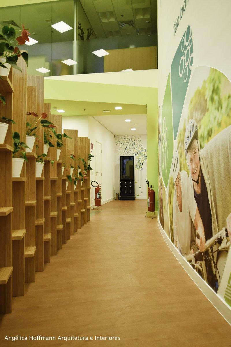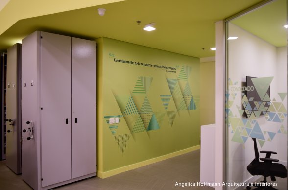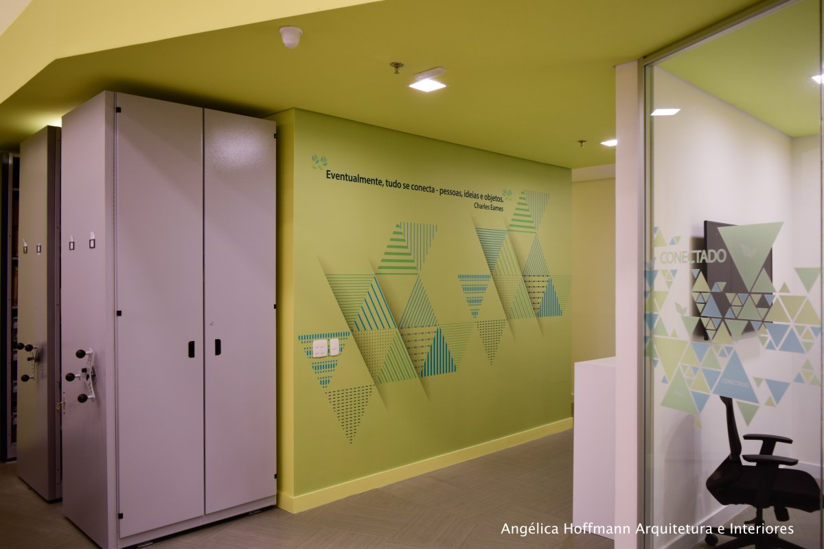 A área dos colaboradores optamos pelo branco, cinza e os tons de verde da logomarca, trazendo a nova identidade visual da empresa para junto dos funcionários, criando assim um clima de mudança e de prosperidade. Uma área com pé-direito baixo foi necessária para manter a privacidade de alguns ambientes, então criamos uma cobertura em drywall com pintura verde, fazendo uma volumetria interessante ao espaço. Toda a Comunicação visual foi desenvolvida pela empresa BBDC Comunicação Integrada.